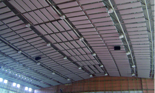 3、吸聲體安裝:吸聲體安裝在懸掛件安裝焊接就位后,用U型環(huán)懸掛,馬道上的吸聲體用鐵絲綁扎,要求排列有規(guī)律,與水平面垂直,整體美觀。吸聲體安裝時(shí)要防止尖銳器具刺破,影響吸音及美觀效果。